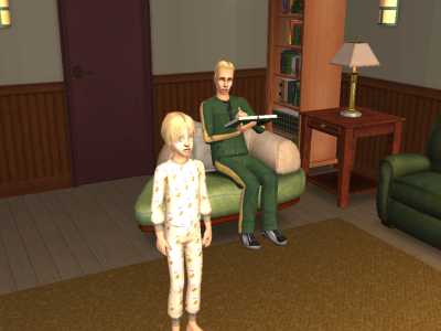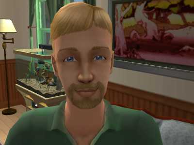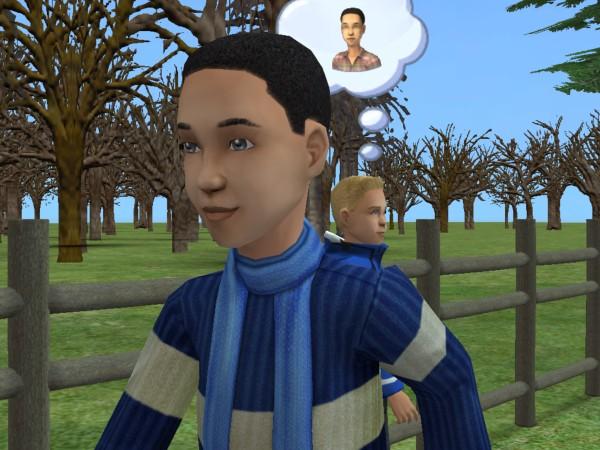 Björn mit seinem Vater. Man sieht's auch an der langen Nase und der dunklen Haut. Nur wo die die roten Haare der Kinder herkommen, bleibt unklar. Vielleicht von Larrys Großmutter Hiroshima Poorman, die violette, also "benutzerdefinierte" Haare hatte. Denn sein Vater Armin Sims hat braune Haare (und als NPC ja keine Eltern).